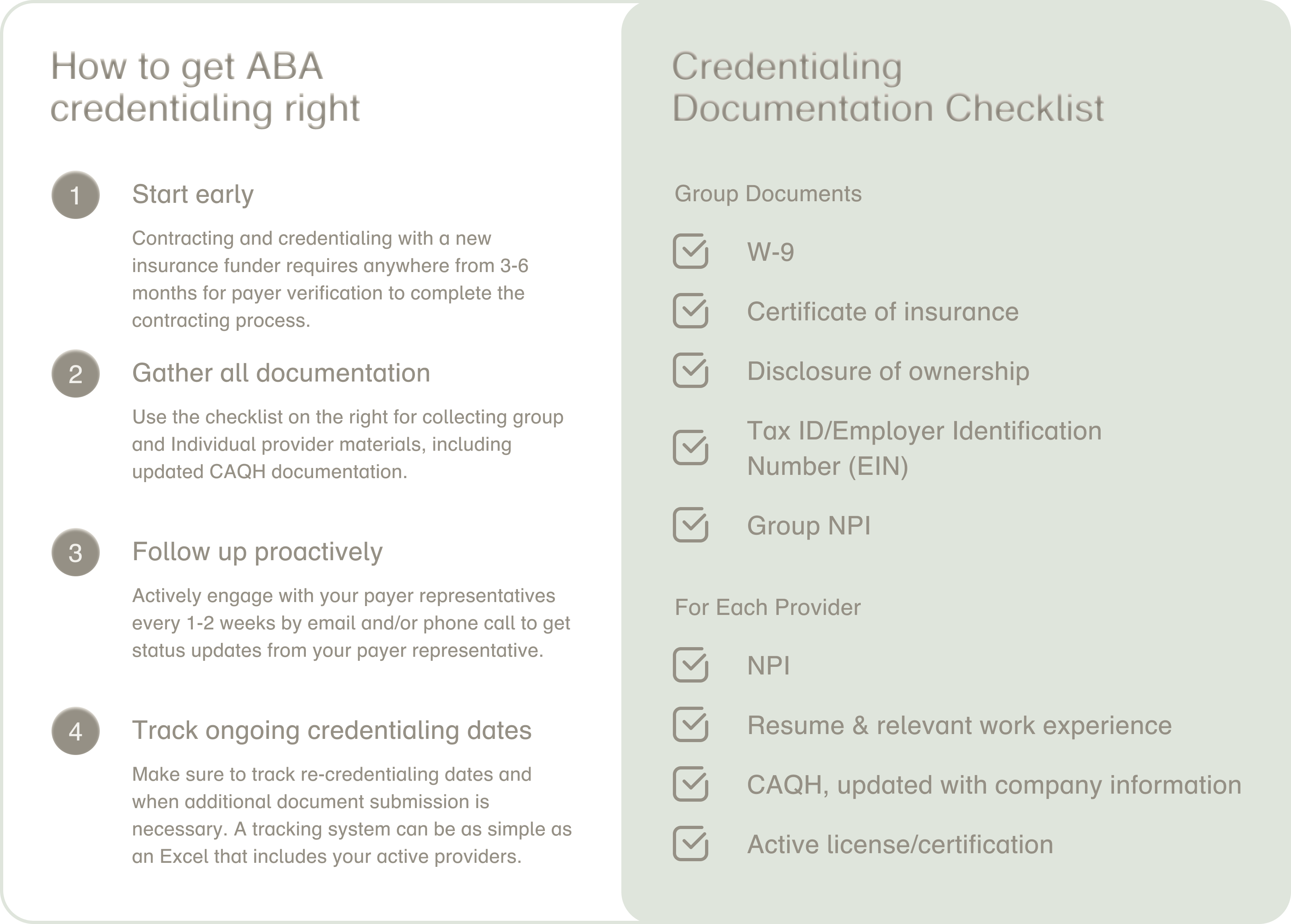 - Credentialing directly impacts the sustainability and growth of ABA practices - prioritize getting this right for greater patient and team satisfaction, and compliance.